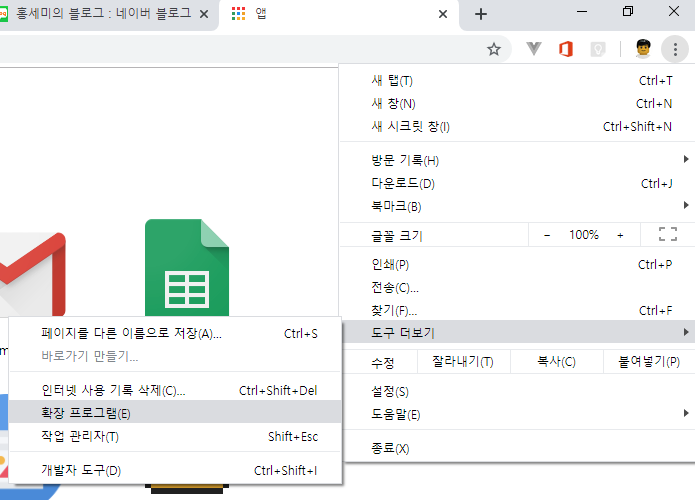 그림과 같이 메뉴 - 도구 더보기 - 확장 프로그램을 클릭합니다.