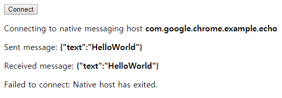 클릭하면 위와 같이 Sent message에 확장 앱에서 보낸 메시지, 그리고 Received message에 C/C++로부터 받은 메시지가 출력되는 것을 확인할 수 있습니다.