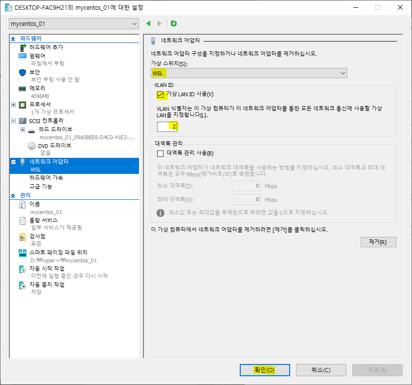 <네트워크 어댑터> 메뉴에서 가상 스위치를 <WSL>로 설정하고 <가상 VLAN ID 사용>을 체크한 후 개수를 "2"로 입력하고 <확인>을 클릭합니다.