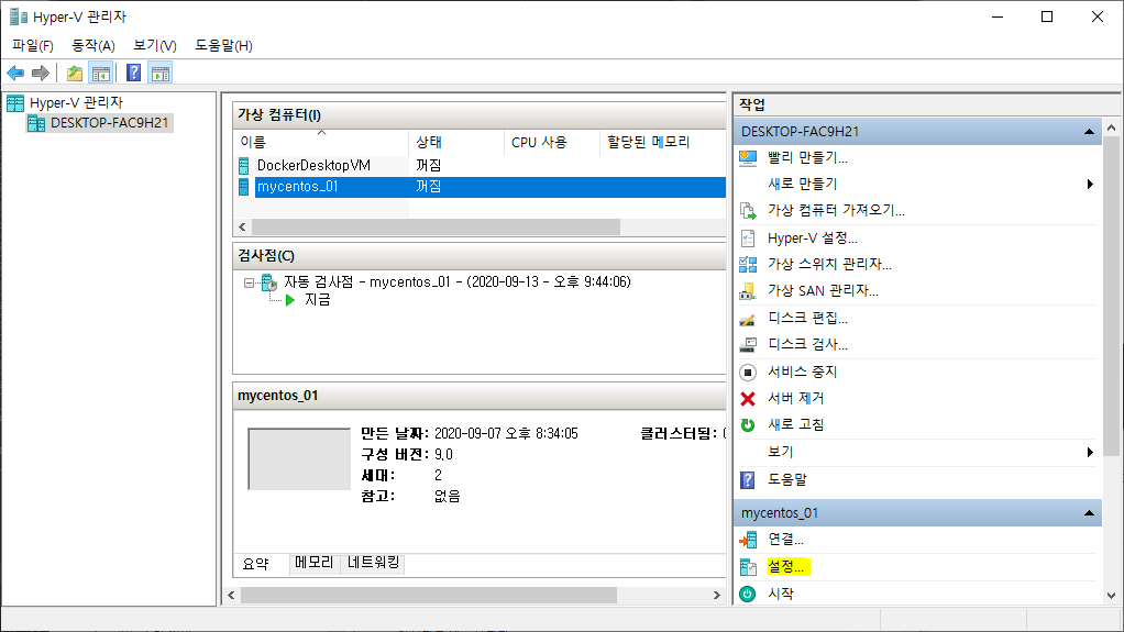 <Hyper-V 관리자> 창에서 설치한 CentOS 7을 클릭한 후 우측 하단의 <설정...>을 클릭합니다.