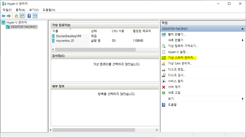 <Hyper-V 관리자> 창을 열고, 우측의 <가상 스위치 관리자>를 클릭합니다.