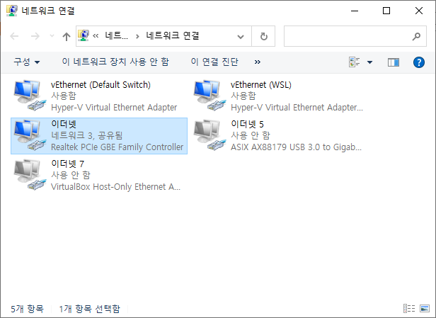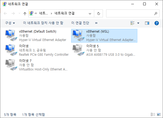 - 네트워크 어댑터 연결창에 vEthernet (Default Switch), vEthernet (WSL), 이더넷 세 개가 존재하는 상태
