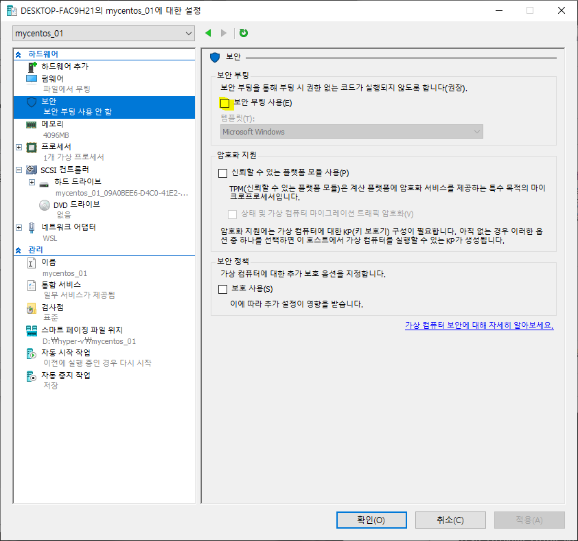 <보안> 메뉴에서 <보안 부팅 사용>을 체크해제 합니다.