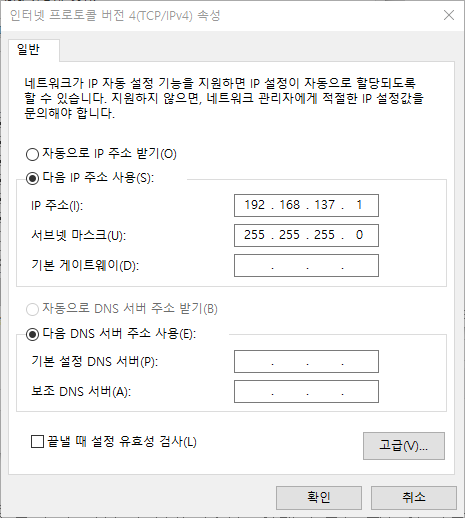 속성창에 입력되어 있는 <IP 주소>와 <서브넷 마스크>를 기억해둡니다.