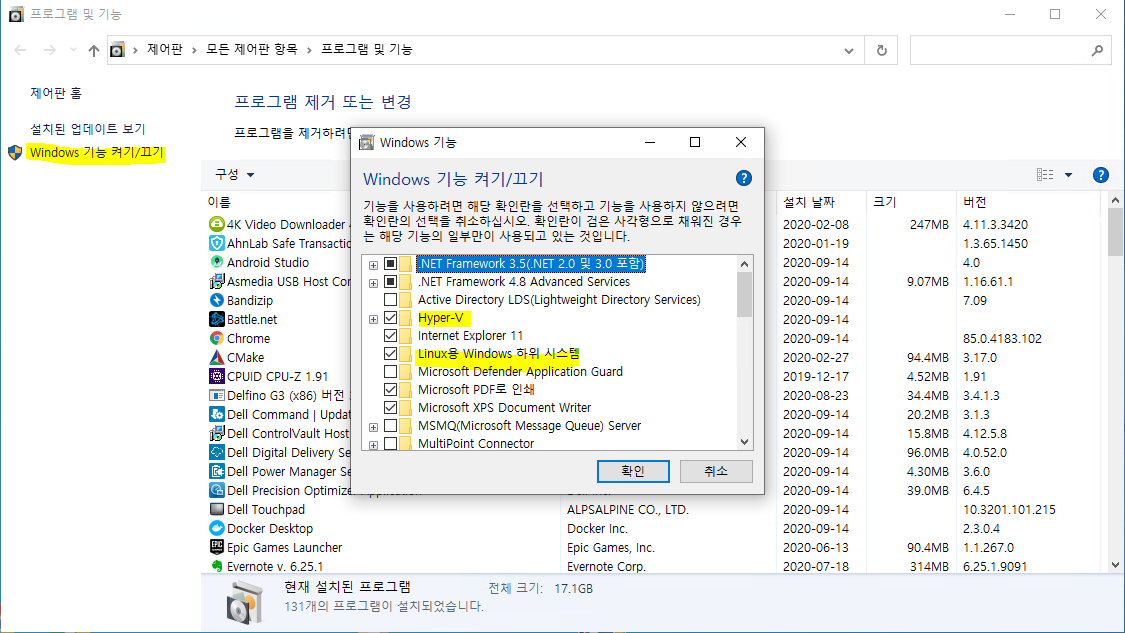 <프로그램 및 기능> - <Windows 기능 켜기/끄기>를 클릭하여 <Hyper-V>와 <Linux용 Windows 하위 시스템>이 체크되어 있는지 확인합니다. 만약, 체크가 안 돼있다면 체크 및 확인 클릭 후 시스템을 재시작해주어야 합니다.