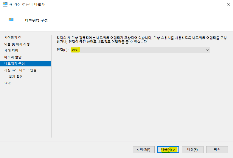 <네트워킹 구성>에서 <연결>을 "WSL"로 선택 후 <다음>을 클릭합니다.
