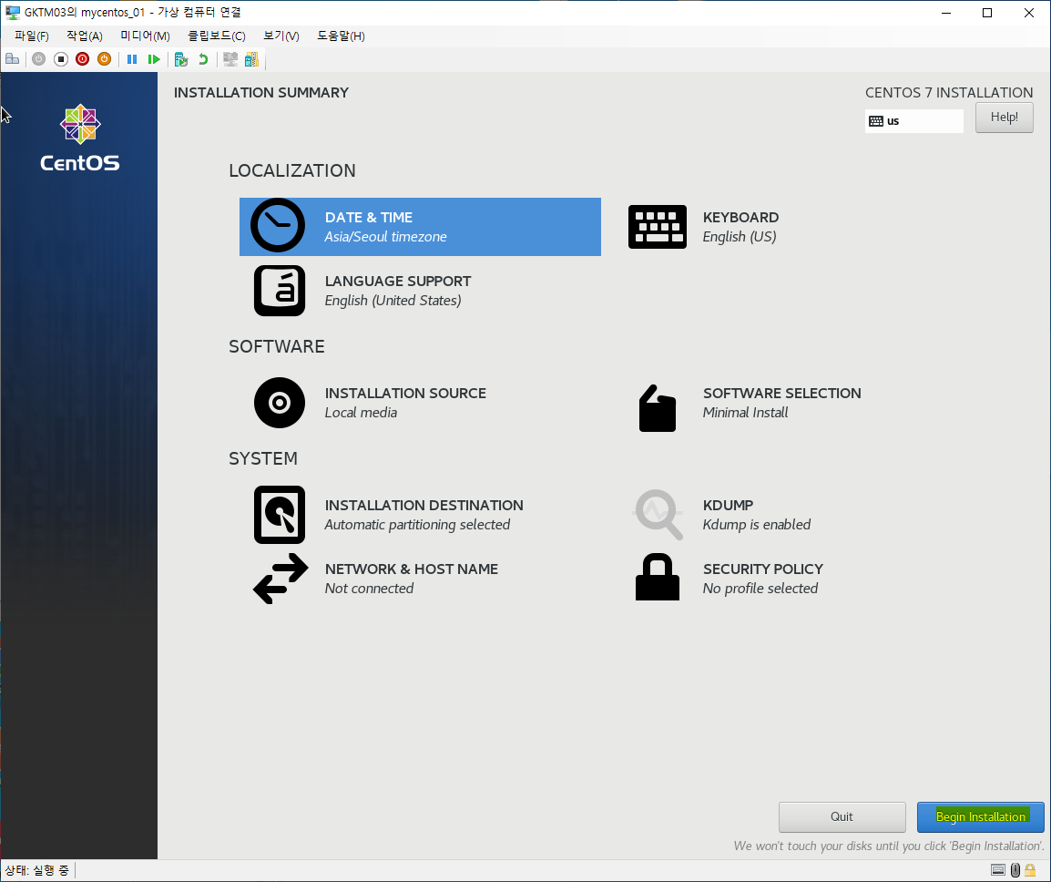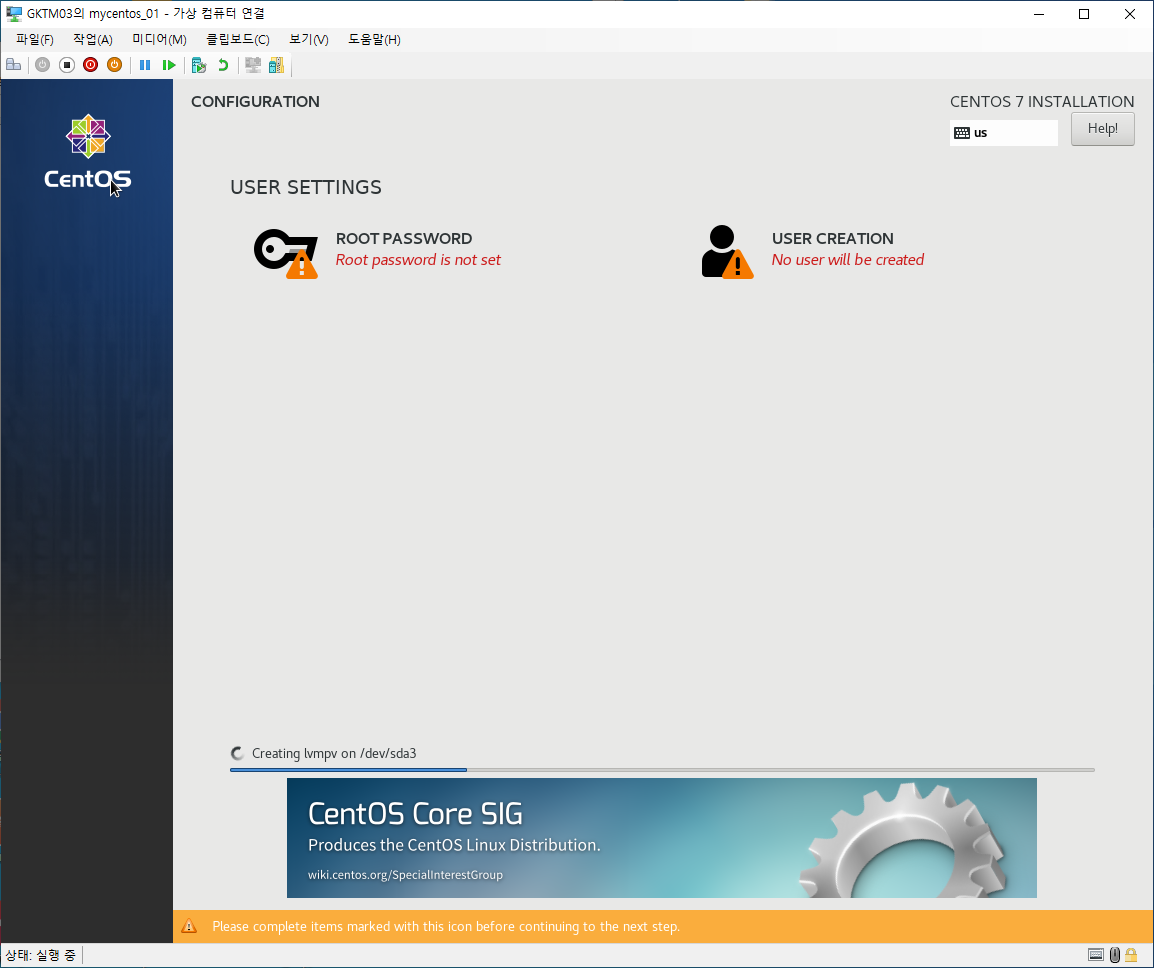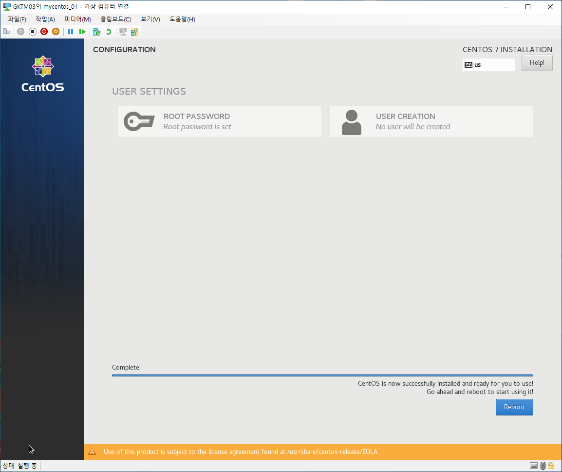 여기까지가 CentOS 7의 설치방법이였으며, 이후 네트워크 설정 방법은 여기를 참조하면 됩니다.