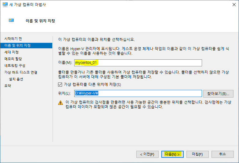 <이름 밍 위치 지정>에서 <이름>을 입력합니다. 그리고 만약 C 드라이브가 SSD라 용량이 부족하다면 HDD를 사용하는 다른 드라이브로 변경한 후 <다음>을 클릭합니다.