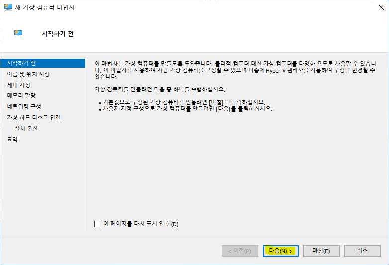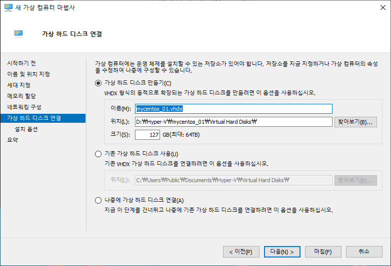 <가상 하드 디스크 연결>에서 기본값을 두고 <다음>을 클릭합니다.