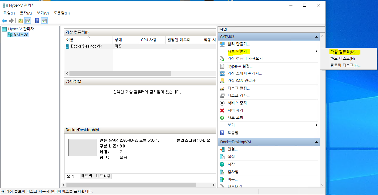 <Hyper-V 관리자> 창에서 <새로 만들기> - <가상 컴퓨터>를 클릭합니다.