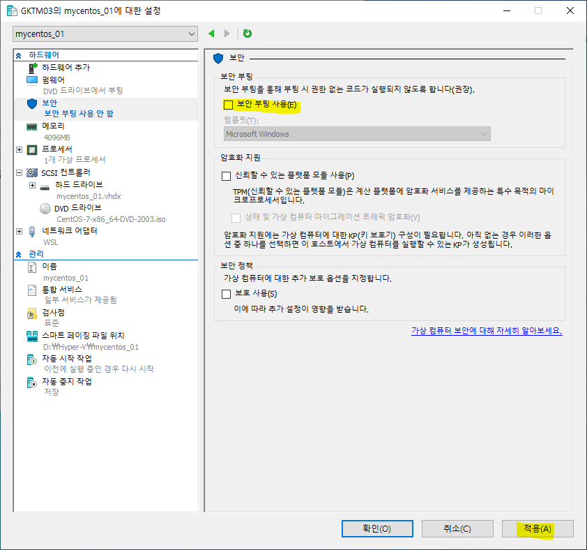 <보안> - <보안 부팅 사용>의 체크를 해제한 후 <적용>을 클릭합니다.