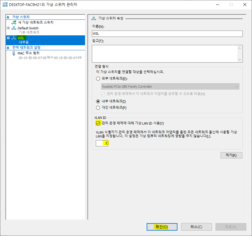 <WSL>을 클릭한 후 <VLAN ID>를 체크하고 개수를 "2"로 입력합니다. 그리고 <확인>을 클릭합니다.