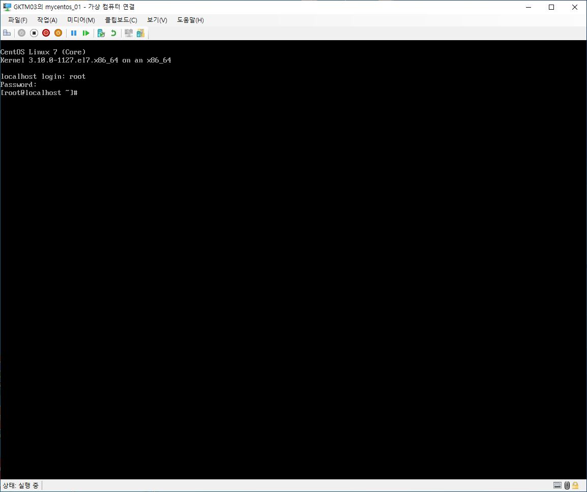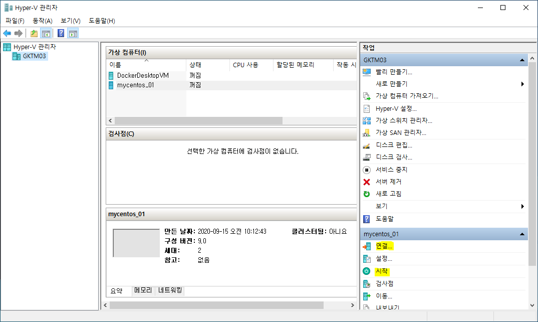 다시 <Hyper-V 관리자> 창에서 새로 생성된 "mycentos_01"을 선택한 후 우측 하단의 <연결> 과 <시작>을 순서대로 클릭합니다. 그러면 <가상 컴퓨터 연결> 창이 새로 나타나게 됩니다.