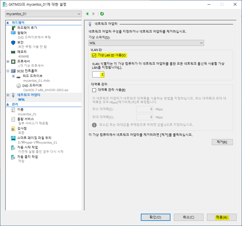 <네트워크 어댑터> - <가상 VLAN ID 사용>의 체크를 한 후 값을 "2"로 입력합니다. 그리고 <적용>을 클릭하고 창을 닫습니다.