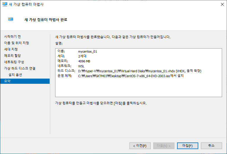 <새 가상 컴퓨터 마법사 완료>에서 정보가 제대로 입력됐는지 확인 후 <마침>을 클릭합니다.