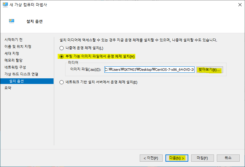 <설치 옵션>에서 "부팅 가능 이미지 파일에서 운영 체제 설치" 선택 후 <찾아보기>를 클릭하여 CentOS 7 ISO 파일을 선택합니다. 그리고 <다음>을 클릭합니다.