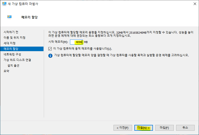 <메모리 할당>에서 메모리 용량이 충분하다면 시작 메모리를 "4096"으로 입력 후 <다음>을 클릭합니다.