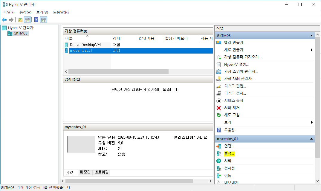 <Hyper-V 관리자> 창에서 새로 생성된 "mycentos_01"을 선택한 후 우측 하단의 <설정...>을 클릭합니다.