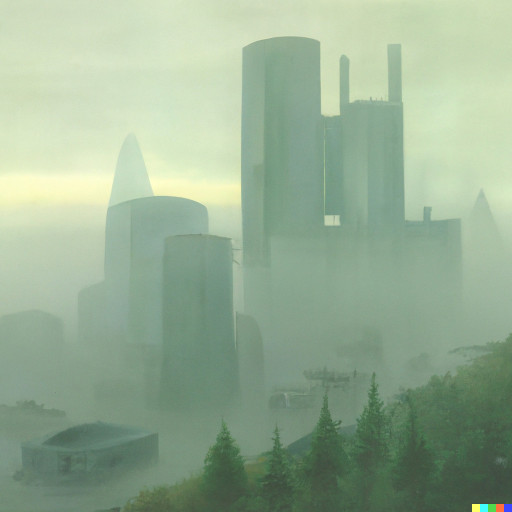 "The misty downtown Seoul landscape depicted by Simon Stålenhag, 1990s, morning" from DALL-E 2