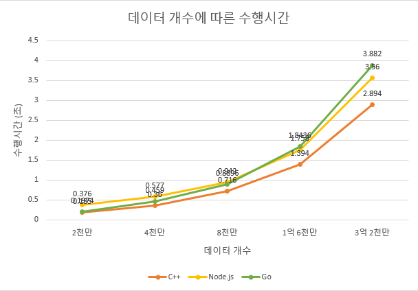 - 데이터 개수가 1억 6천만개 일 때, Node.js의 수행속도가 Go를 제쳤으며, 이후로 데이터 개수가 증가할수록 수행시간의 격차가 점점 더 벌어지게 되었다.