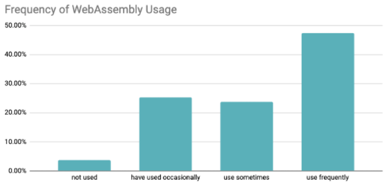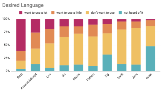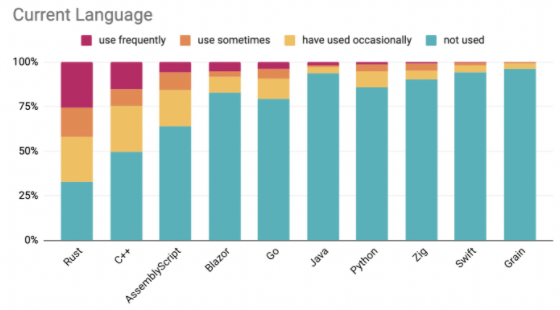 러스트 개발자의 26%가 WA를 빈번하게 사용하고 있으며, C++과 어셈블리스크립트가 뒤를 잇고 있다.