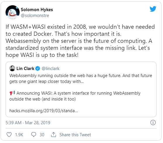 범용 런타임으로서의 WA의 중요성을 도커의 공동 설립자 중 한 명이 자주 인용한 이 트윗에서 가장 적절하게 설명되었다.