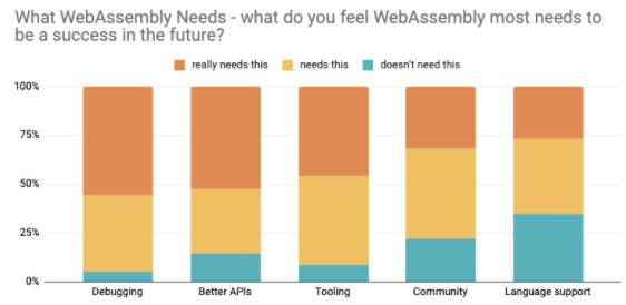 가장 많은 사람들이 더 좋은 디버깅 지원의 필요성을 꼽았다. 툴링에는 일관성이 부족하며, 일부는 소스맵을 사용하고, 다른 일부는 DWARF를 사용한다. 대부분의 경우 중단점, 스택 트레이스 및 로컬 변수 검사를 통한 디버깅을 불가능하다.