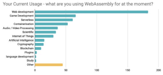 이 설문조사는 또한 사람들이 사용하고 있는 다른 언어들에 대해서도 질문했는데, 적은 수 (각 사례에서 2% 미만)가 Cheerp를 통해 Kotlin, Elixir, 또는 C++를 사용하는 것으로 나타났다.