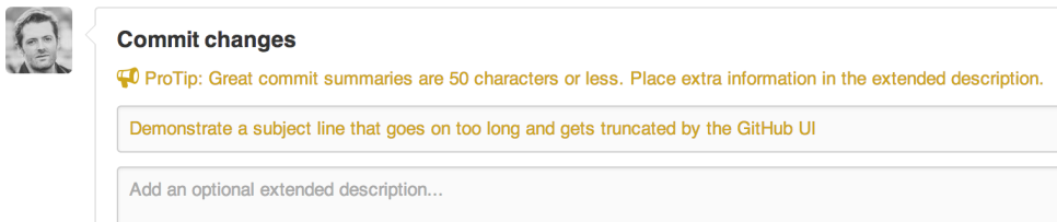 GitHub의 UI는 이러한 규약을 충분히 알고 있는데, 50자 제한을 초과하면 다음과 같이 경고가 표출된다.