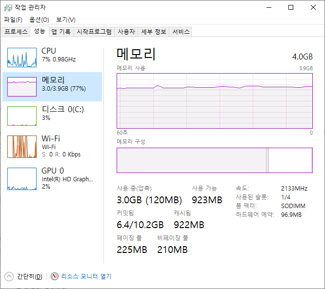 컴퓨터가 부팅하면 BIOS를 거치는데, BIOS에서 물리 메모리 크기를 인식하고, 메모리 관리 권한을 OS에게 넘겨준다. 그 중, BIOS가 OS에게 넘겨주지 않고, 직접 쓰는 메모리 공간이 하드웨어 예약 부분이다. 첫 그림에서는 96.9MB를 BIOS에서 사용하고 있는 것이다.