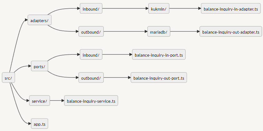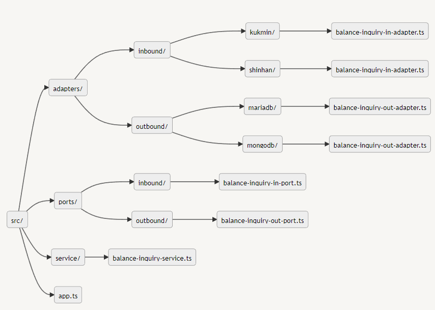이제 서비스는 아웃바운드 포트인 IBalanceInquiryOutPort를 통해 아웃바운드 어댑터에 잔액조회를 요청할 수 있습니다.