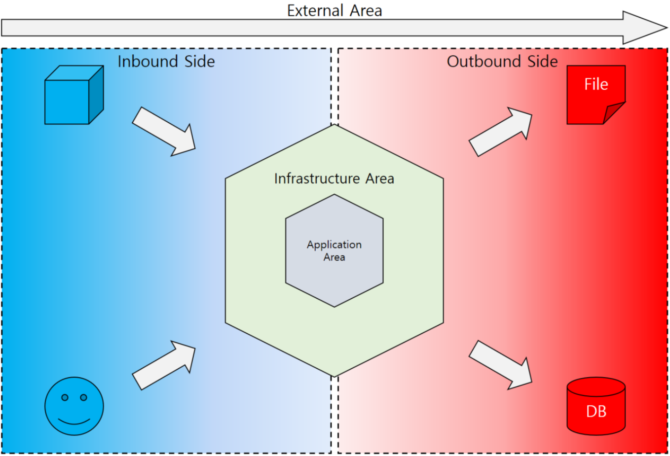 인바운드 측 외부 액터는 서버 또는 유저가 될 수 있으며, 아웃바운드 측 외부 액터는 DB (Database), 파일, 캐시 또는 다른 서버가 될 수 있습니다.