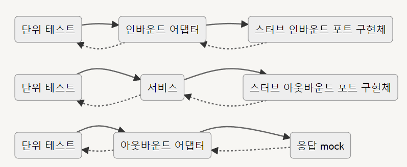 서비스에 대한 단위 테스트를 수행하기 위해 스터브 아웃바운드 포트 구현체를 의존성으로 주입합니다. 스터브 아웃바운드 포트 구현체는 전달받은 요청에 대해 사전에 정의된 적절한 응답 값을 즉시 반환합니다.