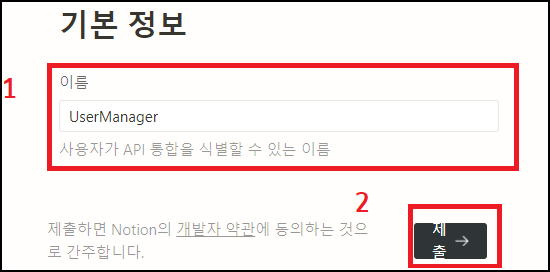기본 정보 페이지에서 새 API 통합의 이름을 입력하고, 하단의 <제출> 버튼을 클릭합니다. (나머지는 건들지 않음)