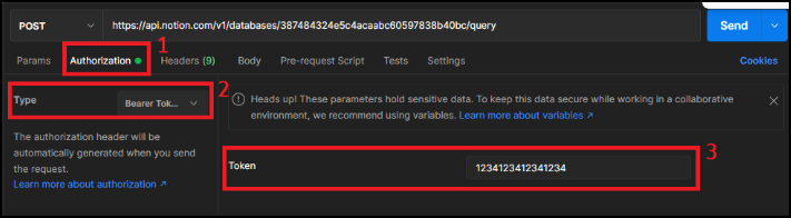 추가적으로, <Step 1.2.>에서 보관해둔 프라이빗 API 통합 토큰을 Postman에서 <Authorization> 탭의 타입을 <Bearer Token>으로 설정한 후 Token 값으로 입력합니다.