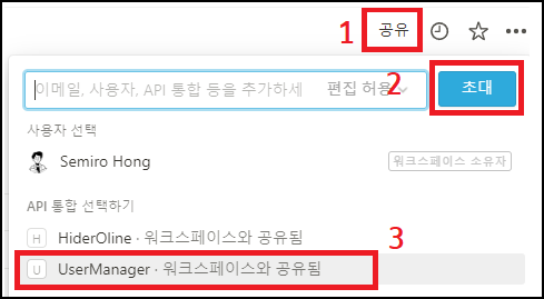 UserManager 워크스페이스를 선택하고 다음 창에서 <초대> 버튼을 클릭하면 완료됩니다.
