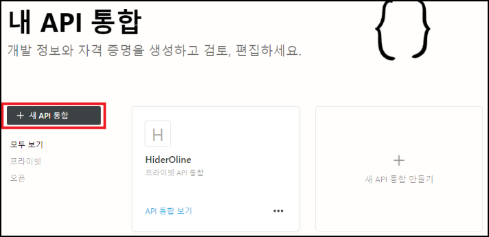 여기서 좌측의 <새 API 통합> 버튼을 클릭합니다.
