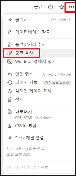 통합 API에 데이터베이스가 공유되었기 때문에 이제 Postman으로 조회가 가능합니다. 노션 데이터베이스 페이지에서 우측 상단의 <설정> - <링크 복사>를 클릭하면 페이지 URL이 복사됩니다.