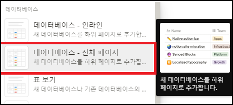 노션에서 컴포넌트 중에 <데이터베이스 - 전체 페이지>를 추가합니다.