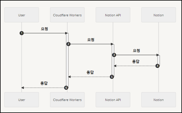 여기서, 우리는 Cloudflare Workers를 이용하여 사용자로부터 CRUD 요청을 받아 적절한 Notion API를 호출하도록 시스템을 구축하면 됩니다.
