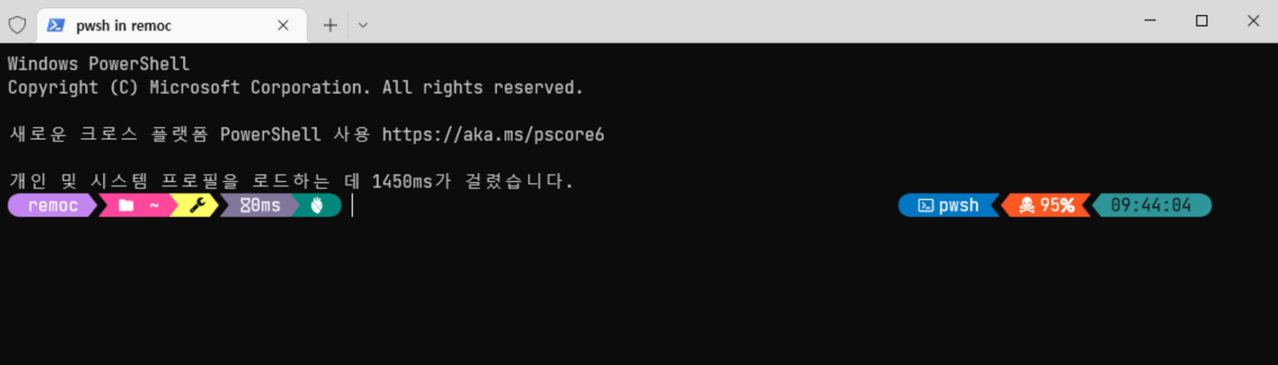 기존에 열었던 파워쉘을 모두 닫고 다시 열면 oh-my-posh가 적용된 것을 확인할 수 있습니다.