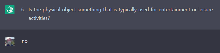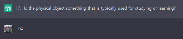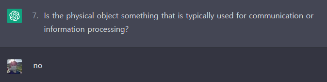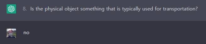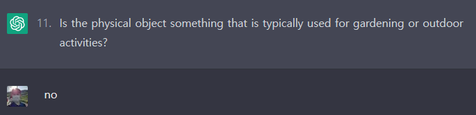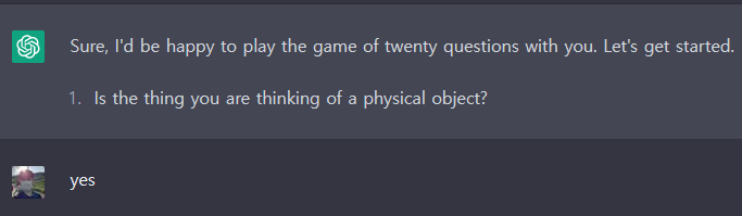 ChatGPT와 스무고개 게임은 가능한 것으로 보입니다. 위의 바나나 문제에서는 비록 ChatGPT가 답을 맞추지 못했으나, 여러 번 시도했을 때 종종 답을 맞추긴 했습니다. 아직 아키네이터처럼 완벽하게 추론하지는 못하는 것 같으나, GPT-4에서는 잘 맞추지 않을까 기대해봅니다.