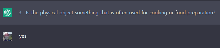 ChatGPT: 당신이 생각하고 있는 물리적 물체는 대부분의 가정에서 흔히 볼 수 있는 것으로, 요리나 음식 준비에 자주 사용되는 것으로 주방 기구의 일종은 아닙니다. 이러한 단서를 바탕으로 생각하고 있는 대상이 과일, 야채, 곡물 또는 단백질 공급원과 같은 음식 유형일 가능성이 있습니다. 맞습니까?