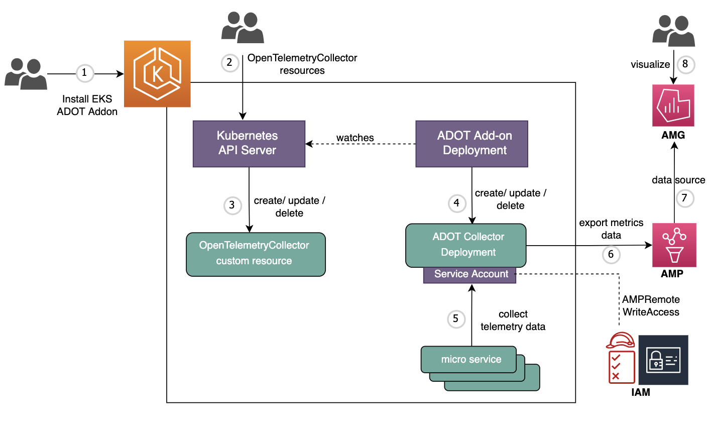 ADOT는 Amazon EKS 클러스터에서 사용할 수 있습니다. ADOT를 사용하려면 EKS 클러스터에 ADOT 오퍼레이터를 설치해야 합니다. ADOT 오퍼레이터는 ADOT 콜렉터를 생성하고 관리합니다.