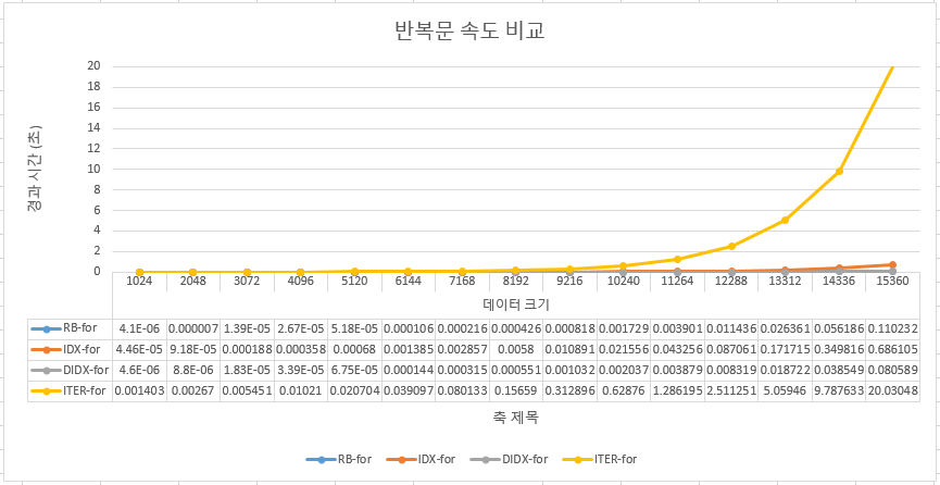 vector 컨테이너에 대한 반복문을 수행하는 방법은 1) 범위 기반 for 문, 2) 인덱스 접근 for 문, 3) 데이터 배열 취득 후 인덱스 접근 for문, 4) 반복자 사용 for 문 있다. 각각의 방식에 대한 성능이 궁금해져서 각 방식에 대한 성능을 측정해보기로 하였다. 데이터 크기만큼 int형 원소를 갖는 vector를 생성한 후 각 방식대로 반복문을 수행하면서 각 원소에 1이라는 값을 대입하였다. 데이터 크기를 1024, 2048, 4096, ..., 16777216 과 같이 1024부터 두 배씩 증가하여 각 방식의 성능을 측정하였며, 이 작업을 열 번 반복하여 평균을 내었다. 소스코드는 다음과 같다. #include #include #include #include #include #in..